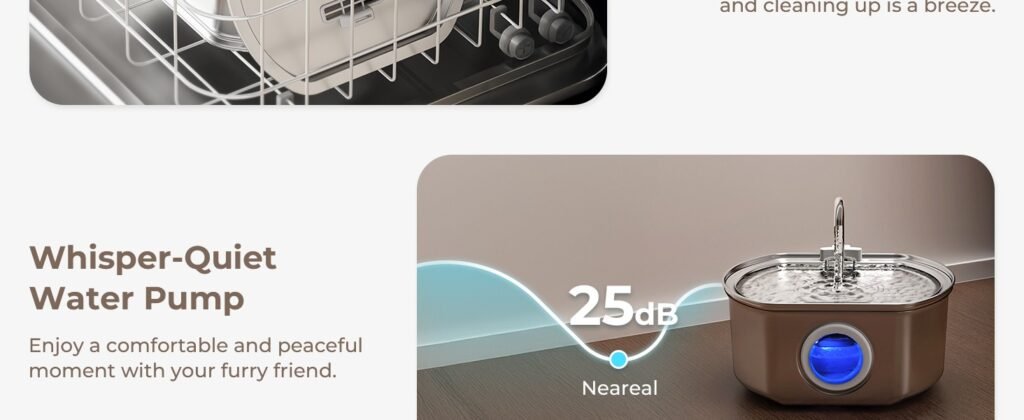 - Ultra-Silent 5 V Pump: Engineered for your pet’s comfort, pet fountain features an ultra-silent 5 V pump that operates at a gentle ≤ 28 dB, allowing your furry friend to enjoy a peaceful drink without any disturbances; Rest assured, your pet won’t be startled by loud noises, and you can maintain their daily routine undisturbed; Plus, its efficient design ensures minimal power consumption