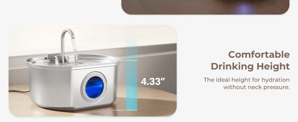 - Water Level Window & Stainless Steel: Our new design features a water level window, allowing you to effortlessly keep an eye on water levels without ever having to remove the cover of the cat fountain. Crafted from premium 304 stainless steel, it’s not only corrosion-resistant but can also withstand high-temperature cleaning, ensuring your pet’s health and safety